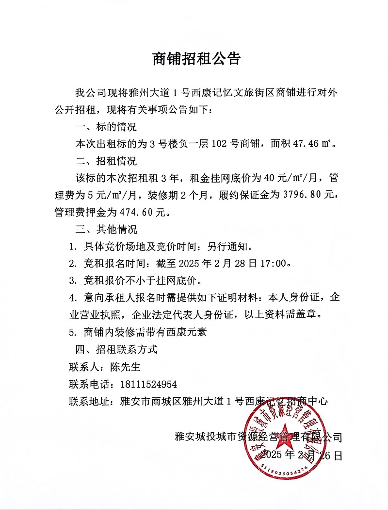 關于雅州大道1號西康記憶文旅街區(qū)3號樓負一層102號商鋪招租公告