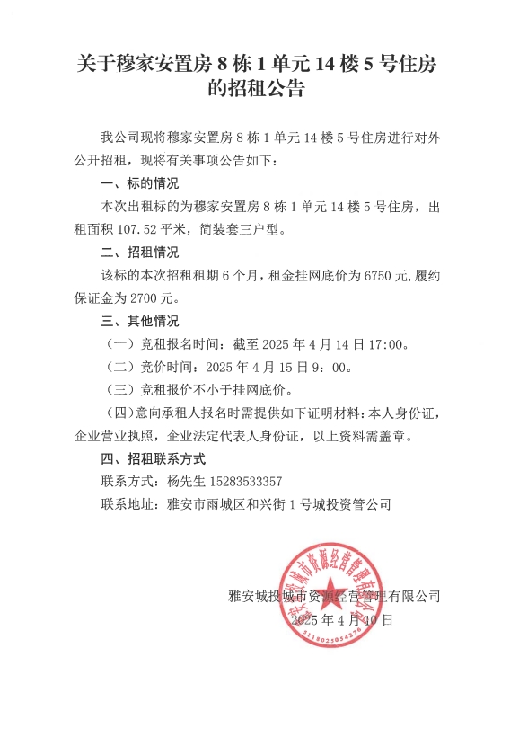 關(guān)于穆家安置房8棟1單元14樓5號(hào)住房的招租公告