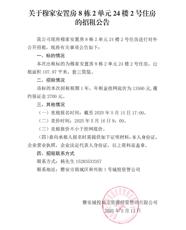 關(guān)于穆家安置房8棟2單元24樓2號住房的招租公告