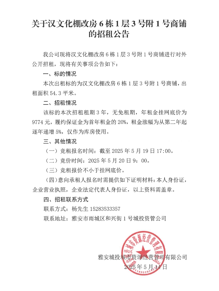 關(guān)于漢文化棚改房6棟1層3號附1號商鋪的招租公告