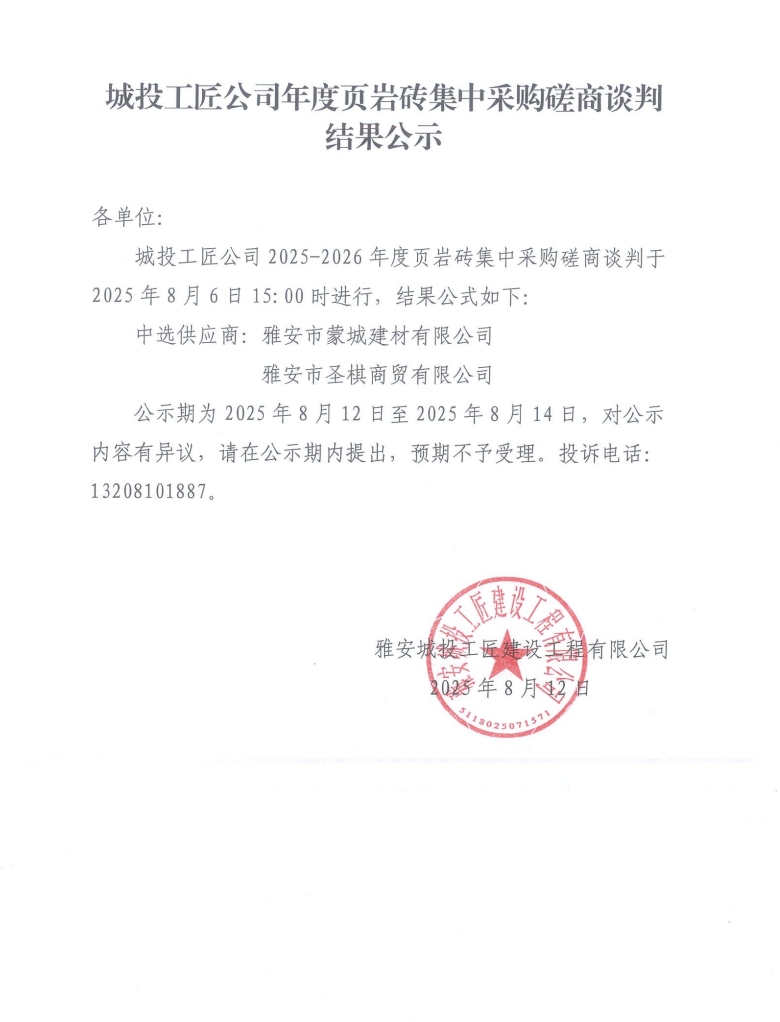 城投工匠年度頁巖磚集中采購(gòu)磋商談判結(jié)果公示