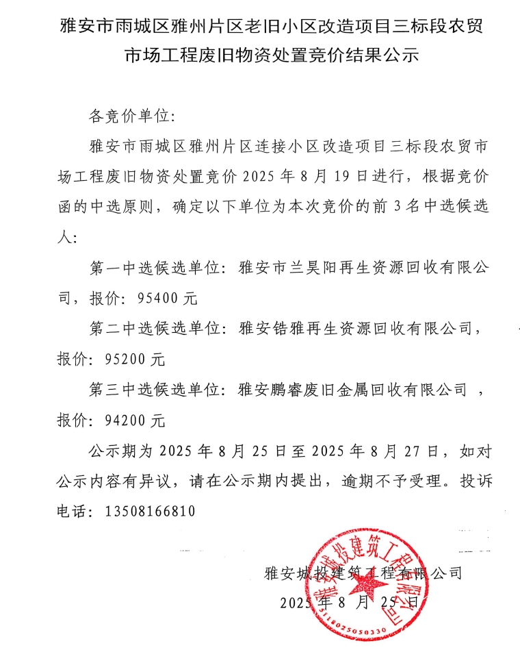 雅安市雨城區(qū)雅州片區(qū)老舊小區(qū)改造項目三標(biāo)段農(nóng)貿(mào)市場工程廢舊物資處置競價結(jié)果公示