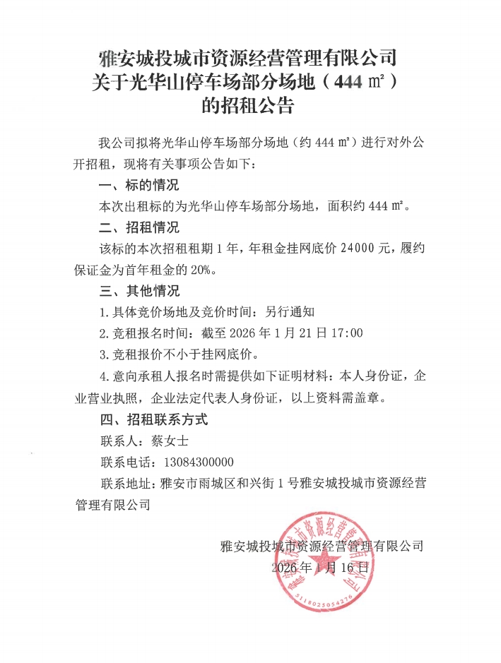 雅安城投城市資源經(jīng)營管理有限公司關于光華山停車場部分場地(444㎡)的招租公告