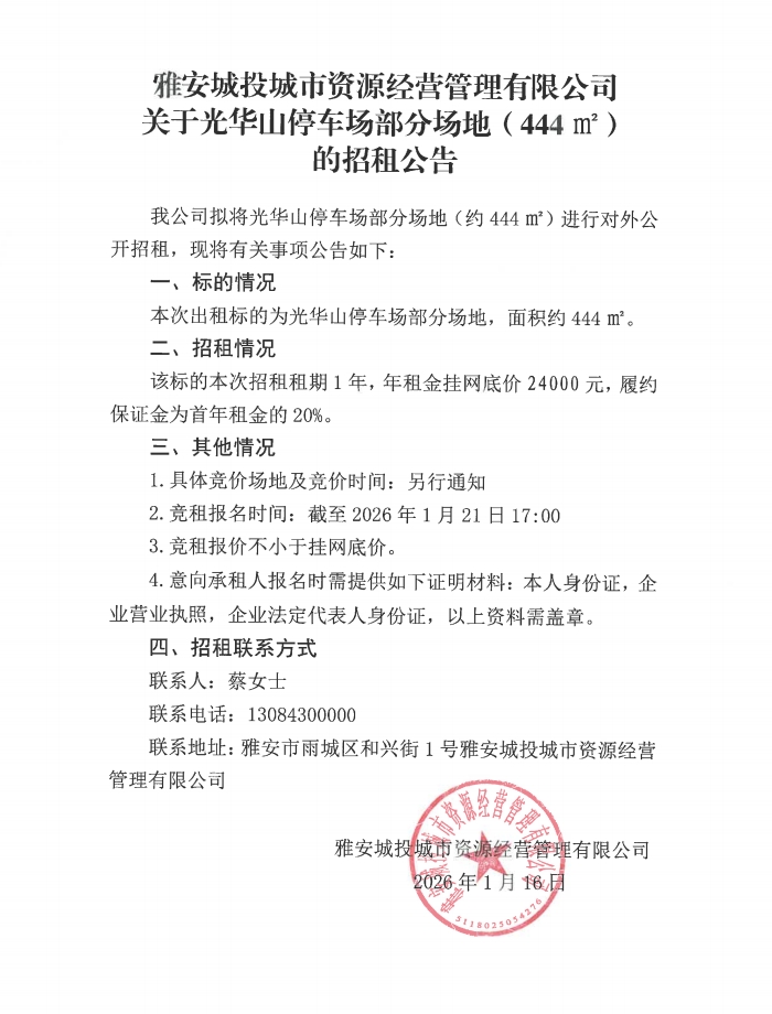 雅安城投城市資源經(jīng)營管理有限公司關(guān)于光華山停車場部分場地(444㎡)的招租公告