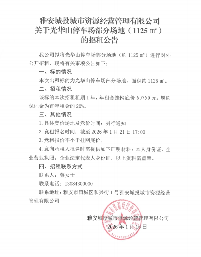 雅安城投城市資源經(jīng)營管理有限公司關(guān)于光華山停車場(chǎng)部分場(chǎng)地(1125㎡)的招租公告