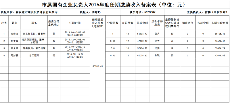 市屬國有企業(yè)負責(zé)人2016年度任期激勵收入備案表