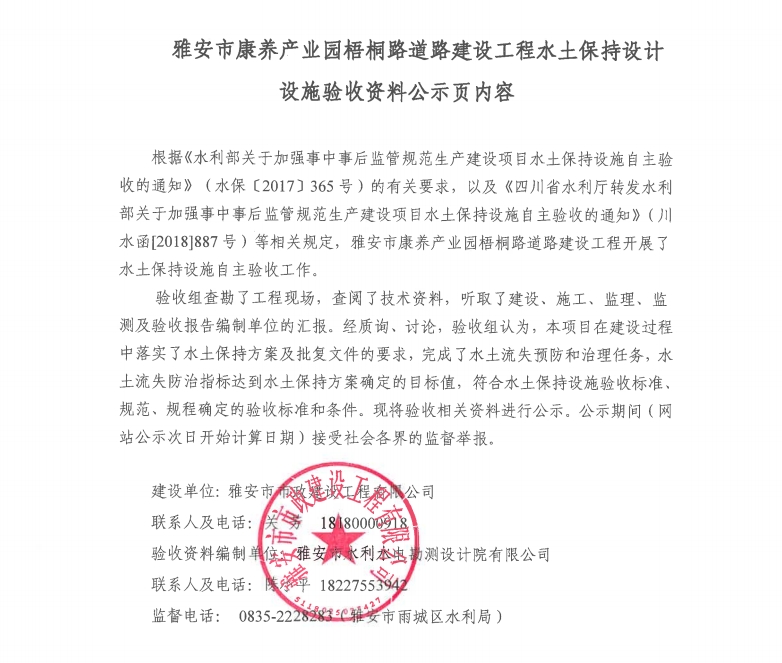 雅安市康養(yǎng)產(chǎn)業(yè)園梧桐路道路建設(shè)工程水土保持設(shè)計(jì)設(shè)施驗(yàn)收資料公示頁(yè)內(nèi)容