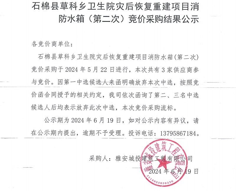 石棉縣草科鄉(xiāng)衛(wèi)生院災(zāi)后恢復(fù)重建項(xiàng)目消防水箱(第二次)競(jìng)價(jià)采購(gòu)結(jié)果公示